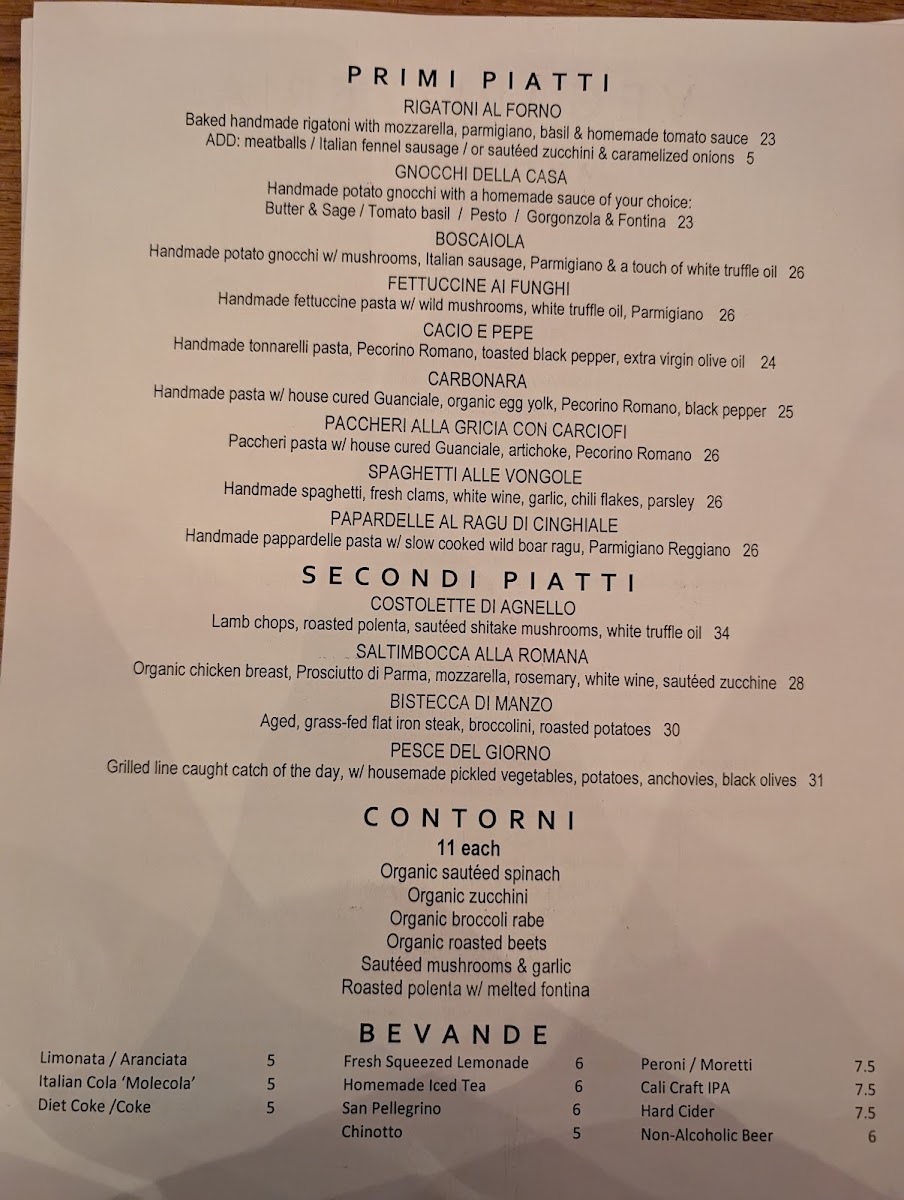 Overall, the menu is structured to accommodate a range of dining needs from light antipasti and quick bites to full-course meals with paired beverages. The presence of traditional Italian ingredients and preparations makes the offerings suitable for casual dining as well as more leisurely meals.