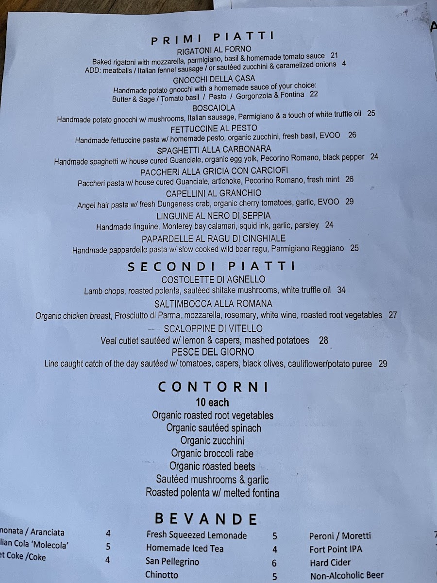 The menu at this Italian restaurant in San Francisco offers a variety of traditional and contemporary Italian dishes alongside a selection of beverages and desserts. The food options are categorized for ease of browsing and catering to different dining preferences.